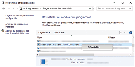 Sélectionnez et double-cliquez sur le pilote TWAIN/WIA puis cliquez sur [Désinstaller/Modifier] ou sur [Désinstaller].