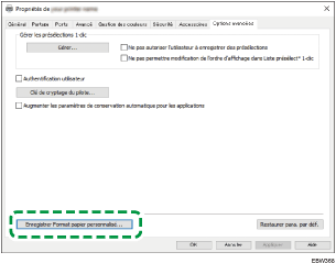 Cliquez sur l'onglet [Options avancées], puis cliquez sur [Enregistrer Format papier personnalisé...].