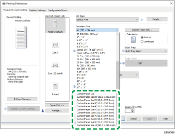 Une fois que le format personnalisé est enregistré, vous pouvez le sélectionner dans « Format du document : » du pilote d'impression.