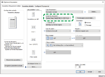 Pour sélectionner le format personnalisé enregistré dans [Propriétés de l'imprimante], cliquez sur « Format du document » et sélectionnez le format personnalisé.