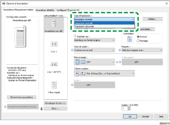 Sélectionnez [Impression sécurisée] dans "Type d'impression " sur l'onglet [Paramètres fréquemment utilisés] dans le pilote d'impression.