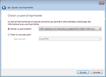 Sélectionnez le port WSD dans « Utiliser un port existant : » puis cliquez sur [Suivant].