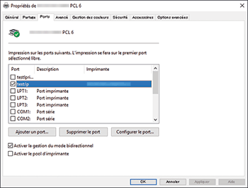 Si le port à supprimer est attribué à l'imprimante dont l'écran de propriétés s'affiche actuellement, cochez la case d'un autre port puis cliquez sur [Appliquer].