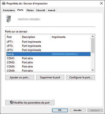 Sélectionnez un port à supprimer dans l'onglet [Ports], puis cliquez sur [Supprimer le port]