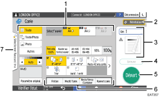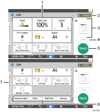 Affiche une image représentant la quantité et les paramètres configurés sur l'écran Copie. Appuyez sur [Quantité] pour afficher les touches numérotées. Appuyez sur l'image pour afficher la liste des paramètres.