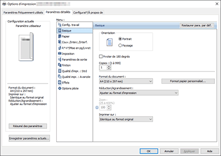 Vous pouvez définir les paramètres d'impression dans l'onglet [Paramètres fréquemment utilisés] et dans l'onglet [Paramètres détaillés]. Les paramètres de base peuvent être définis dans l'onglet [Paramètres fréquemment utilisés], même si vous n'utilisez pas l'onglet [Paramètres détaillés].