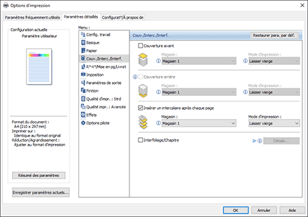 Configurez les paramètres dans le menu [Couv./Intercal./Interfol.] de l'onglet [Paramètres détaillés].