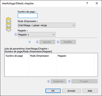 Numéro de page : indiquez les numéros de page des premières pages de section en insérant une virgule entre les numéros. La page d'interfoliage est insérée juste avant la page indiquée. Vous pouvez indiquer jusqu'à 20 numéros de page.