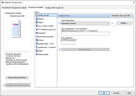 Indiquez « Code de classification » depuis le menu [Config. travail] de l'onglet [Paramètres détaillés].