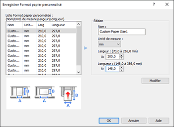 Sélectionnez l'option dans laquelle vous souhaitez enregistrer le format personnalisé dans « Liste Format papier personnalisé : ».