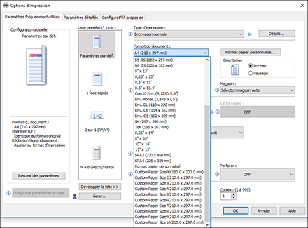 Pour sélectionner le format personnalisé enregistré dans [Propriétés de l'imprimante], cliquez sur « Format du document : » et sélectionnez le format personnalisé.