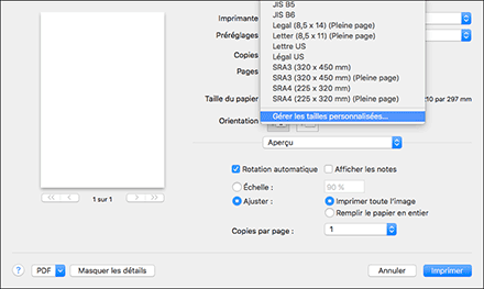 Dans OS X ou macOS, il n'est pas nécessaire d'enregistrer le format personnalisé au préalable, étant donné que vous pouvez le spécifier et l'enregistrer sur l'écran Paramètres de l'imprimante.