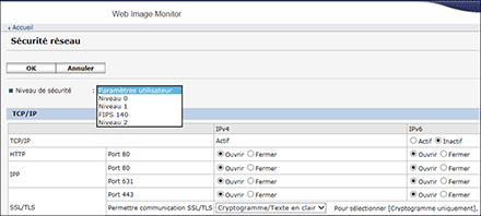 Vous pouvez choisir parmi quatre niveaux de sécurité combinant différents protocoles, ports et algorithmes de chiffrement. Confirmez la description de chaque niveau dans Liste de paramétrages de niveau de sécurité.