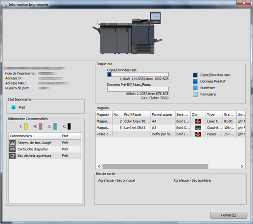 [Disque dur] | Affiche sous forme de graphique et de valeurs numériques l'espace disque utilisé et l'espace libre nécessaire à la copie et aux données de tramage de la tâche. Affiche également sous forme de graphique et de valeurs numériques l'espace disque utilisé et l'espace libre nécessaire aux données de prétramage, à la numérisation et au formulaire. Le nombre de tâches en attente est également affiché. |