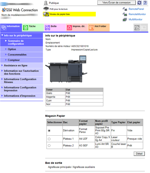 PageScope Web Connection est un programme utilitaire de contrôle de périphérique. Cet utilitaire permet d'afficher l'état de l'imprimante, du scanner et du réseau, de procéder à l'entretien de la machine ou d'effectuer les réglages sécurité, imprimante, scanner et réseau avec un navigateur web.