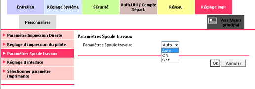 Sélectionnez [Auto] ou [ON] ou [OFF] dans la liste déroulante de [Paramètres Spoule travaux].