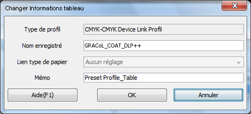 Toutefois, vous ne pouvez pas changer le nom du tableau du profil de lien périphériques CMJN-CMJN enregistré au départ usine.