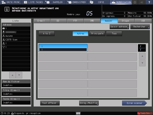 Vous pouvez filtrer le nom de registre en utilisant [A to Z], [Autres] ou [Principale]. Pour en savoir plus, voir Ecran NUMERISER.