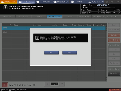Pour annuler la poursuite de la tâche le lendemain, appuyez sur [Non]. L'écran [LISTE TRAVAUX] réapparaît.