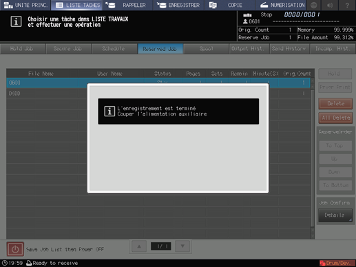 Pour poursuivre les tâches, actionnez l'interrupteur secondaire afin d'afficher l'écran [MACHINE] et appuyez sur la bouton Départ du panneau de contrôle.