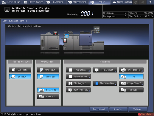 Le réglage de la machine adapte automatiquement le [Type de reliure] de [Réglage sortie] des copies à celui de l'original.