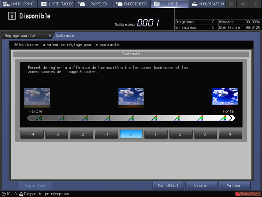 L'écran [COPIER] réapparaît. L'indication [Contraste] se trouve sous l'onglet [Réglage qualité] de l'écran [COPIER].