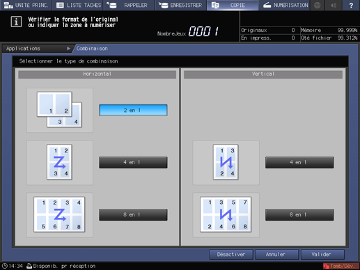 Utilisez cette fonction pour disposer et copier un nombre fixe (2, 4 ou 8) de pages sur une même feuille de papier de façon à réduire la consommation de papier. Les options suivantes sont proposées dans [Combinaison]. La position de départ de combinaison dépend de la configuration de [Direction].