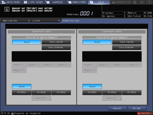 8. Définissez le papier chargé dans l'Unité d'insertion PI-502 comme couverture.
