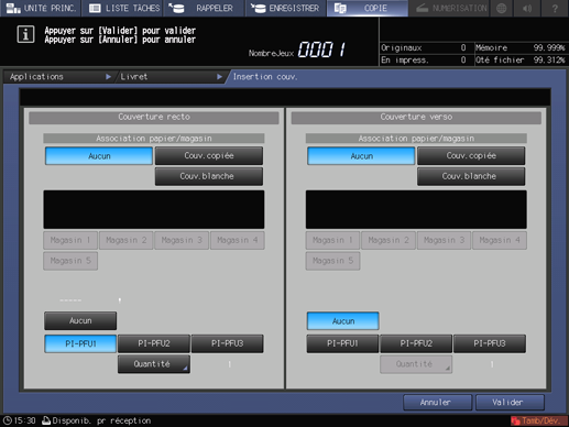 9. Appuyez sur la touche [Valider] de l'écran [Insertion couv.] pour revenir à l'écran [Livret].