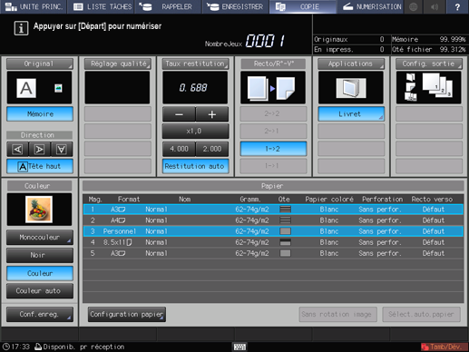 • Sélectionnez un papier pour les pages de corps dans la liste [Papier] de l'écran [COPIER]. Le côté le plus long du papier sélectionné est divisé en deux parties à imprimer. La [Rotat° image automatique] fonctionne selon les besoins. De même, la sélection de [Restitution auto] est automatique.