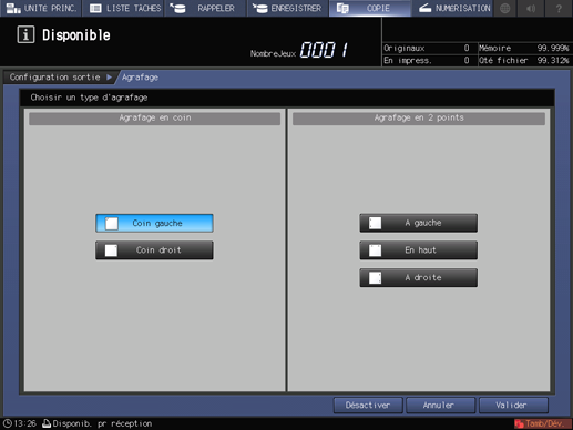 Ce mode réalise l'agrafage des copies. Sélectionnez un des cinq types de position d'agrafage suivants.