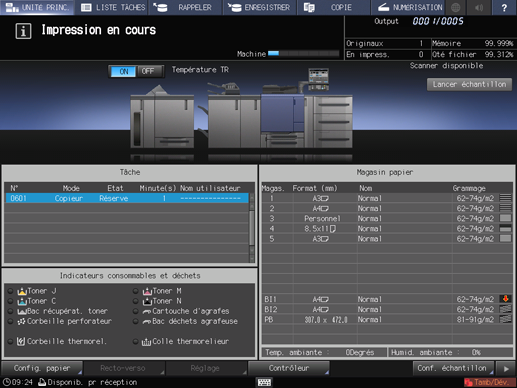 Le bac secondaire est sélectionné automatiquement pour les impressions test. Si une impression est en cours dans le même bac secondaire, vous pouvez définir un autre bac secondaire pour l'impression test. Contactez le technicien SAV.