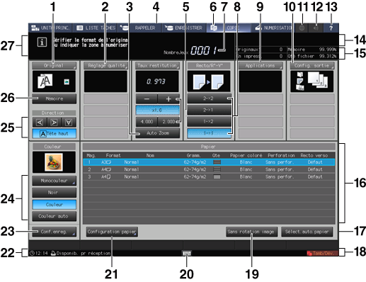 L'écran [COPIER] s'affiche lorsque vous réalisez une copie. Cet écran permet la sélection des conditions de copie, d’impression et des tâches en impression.