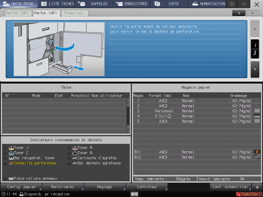 De même, le voyant [Corbeille perforateur] s'allume en rouge dans la zone des Indicateurs consommables et déchets de l'écran [MACHINE].