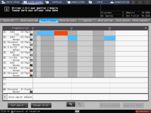 La mise en attente des tâches réservées est aussi disponible sur l'écran [Tâche en cours]. Voir Contrôle et opérations de tâches en cours pour en savoir plus.