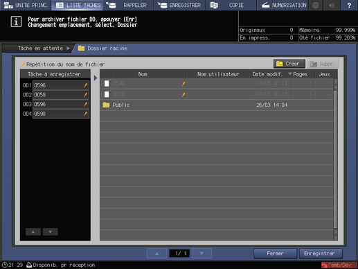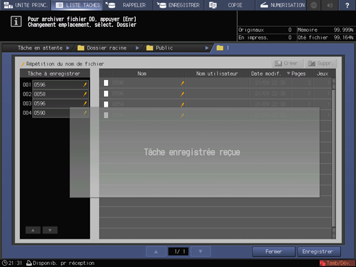 La machine enregistre la tâche sélectionnée à l'étape 3 dans le répertoire spécifié à l'étape 5 du disque dur.