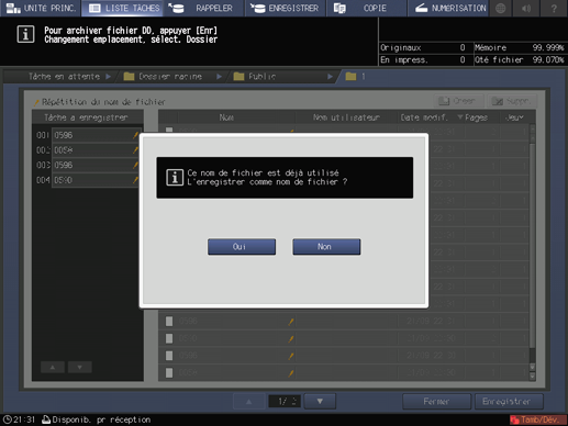Si le nom de fichier de la tâche a été dupliqué, un dialogue de confirmation s'affiche. Appuyez sur [Oui] pour enregistrer la tâche ou sur [Non] pour annuler.