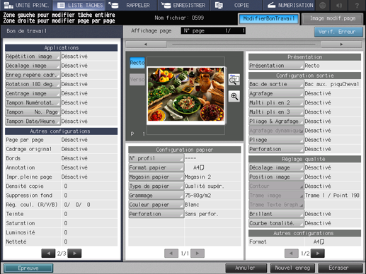 • Pressez [Epreuve] pour sortir et vérifier le réglage modifié. Vous pouvez spécifier un jeu, une feuille dans l'aperçu ou une feuille comme sortie.