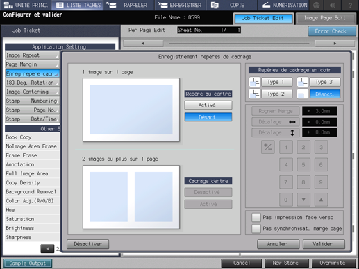 Cette section décrit la fonction Enregistrement des repères de cadrage à spécifier sur l'écran [ModifierBonTravail].