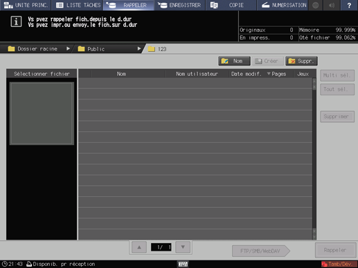 L'écran [Dossier racine] de l'écran [RAPPELER] s'affiche.