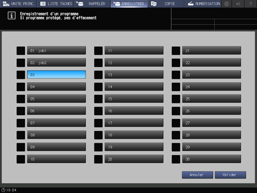 Appuyez sur [Valider] pour revenir à l'écran [Enregistrer les programmes]. Le bouton de la tâche affiche le nome de tâche saisi.