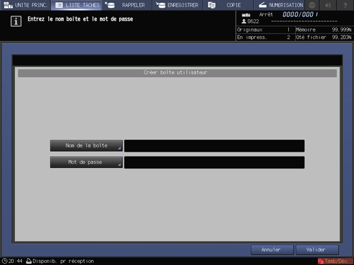 Appuyez sur [Nom boîte utilisateur] pour afficher l'écran de saisie et entrez le nom de la nouvelle boîte sécurisée. Un maximum de 8 caractères alphanumériques est autorisé. Pour finaliser l'entrée, appuyez sur [Valider].