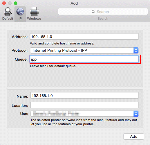 Dans [Address], entrez l'adresse IP de la machine. Dans [Queue], entrez "ipp".