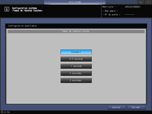 Sélectionnez l'intervalle de temps pour obtenir une réponse de la machine après avoir appuyé sur une touche ou un bouton de l'écran tactile ou du panneau de contrôle.