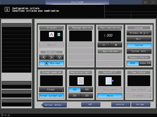 Pour en savoir plus sur la définition des valeurs par défaut de [Type fichier] et [Compression couleur], voir Configuration scanner : définition des valeurs par défaut des fonctions de numérisation.