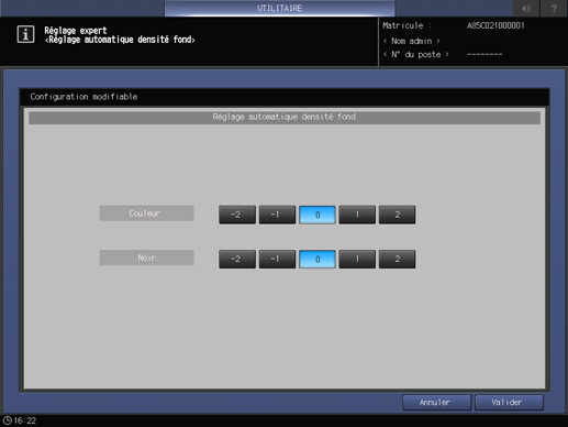 Accueil Paramétrage et réglagesRégl. auto densité fond : changement du niveau de densité noir/couleur dans le réglage automatique du fond