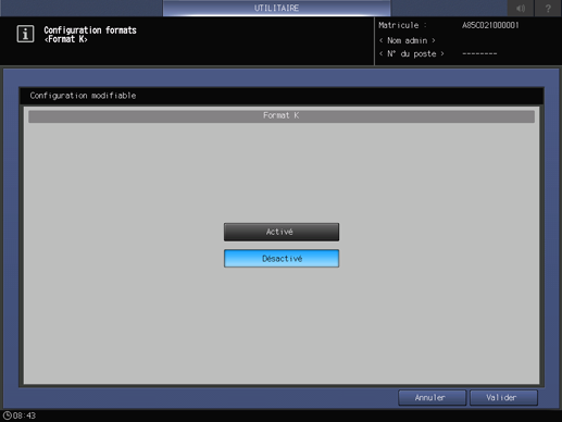 Appuyez sur l'onglet [Configuration système] de l'écran [Menu Réglage administrateur] et appuyez consécutivement sur [Paramétrage formats] et [Format K].