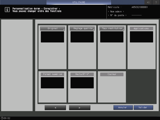 Appuyez sur l'onglet [Configuration système] de l'écran [Menu fonctions administrateur] et appuyez consécutivement sur [Personnalisation écran] et [Conf.personn.écran enr.].