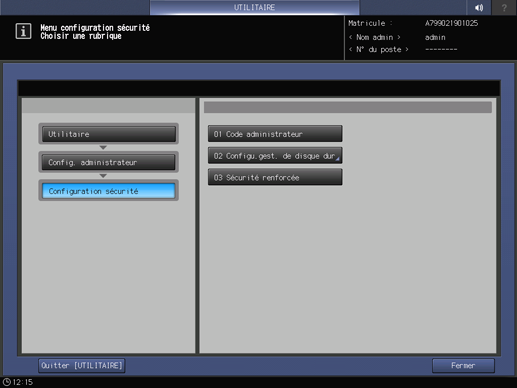 2. Appuyez sur l'onglet [Configuration sécurité] de l'écran [Menu Réglage administrateur] et appuyez sur [Code administrateur].
