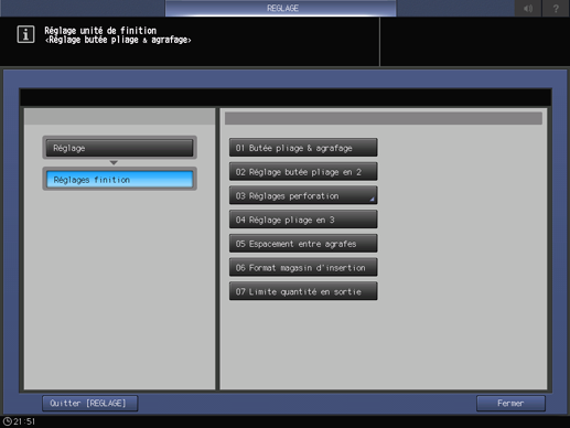 Appuyez consécutivement sur [Réglages finition] et [Réglage butée pliage en 2].